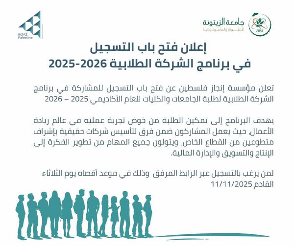 تعلن جامعة الزيتونة للعلوم والتكنولوجيا بالتعاون مع مؤسسة إنجاز فلسطين عن فتح باب التسجيل للمشاركة في برنامج الشركة الطلابية للعام الأكاديمي 2025-2026.