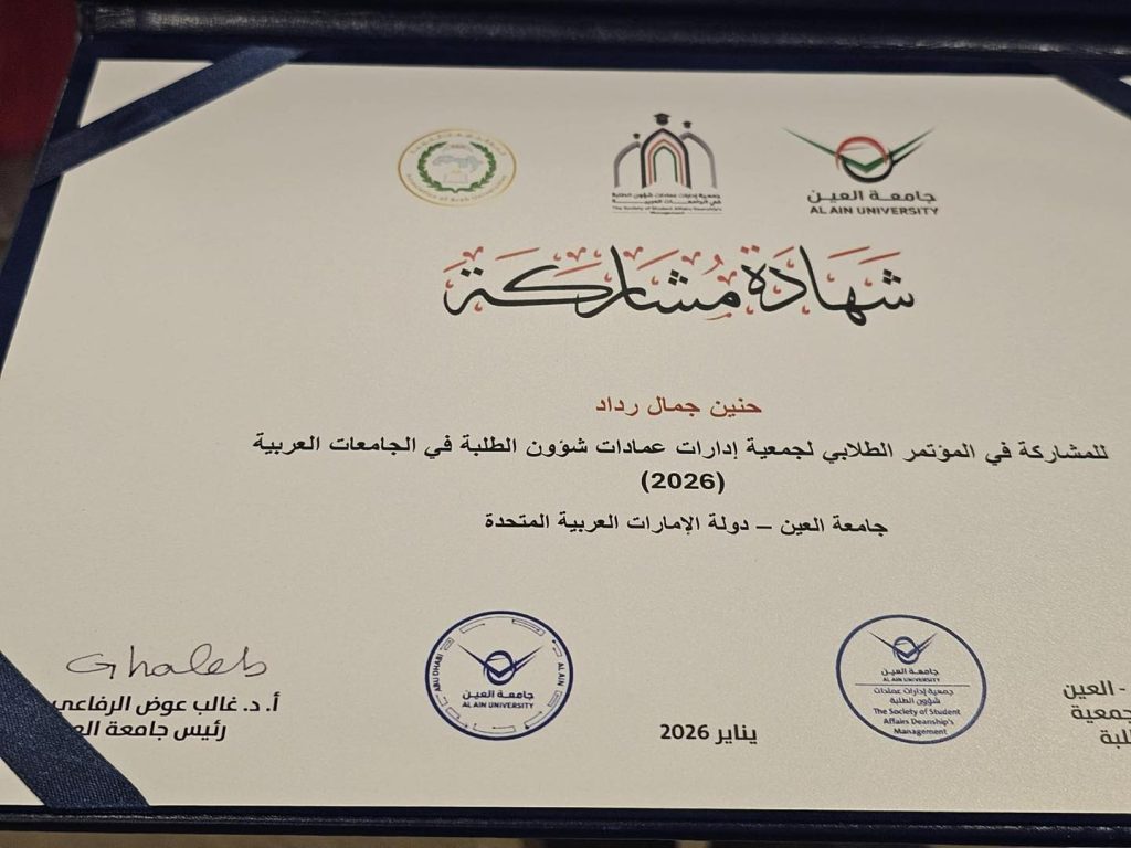 شاركت جامعة الزيتونة للعلوم والتكنولوجيا في أعمال المؤتمر الطلابي السنوي لجمعية إدارات عمادات شؤون الطلبة في الوطن العربي، والاجتماع الثامن للجمعية، والذي استضافته جامعة العين، مقر الجمعية، في مدينة العين بدولة الإمارات العربية المتحدة، خلال الفترة من 25 إلى 29 يناير 2026، تحت عنوان